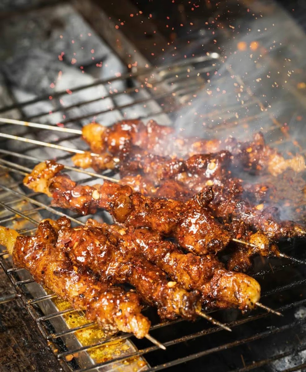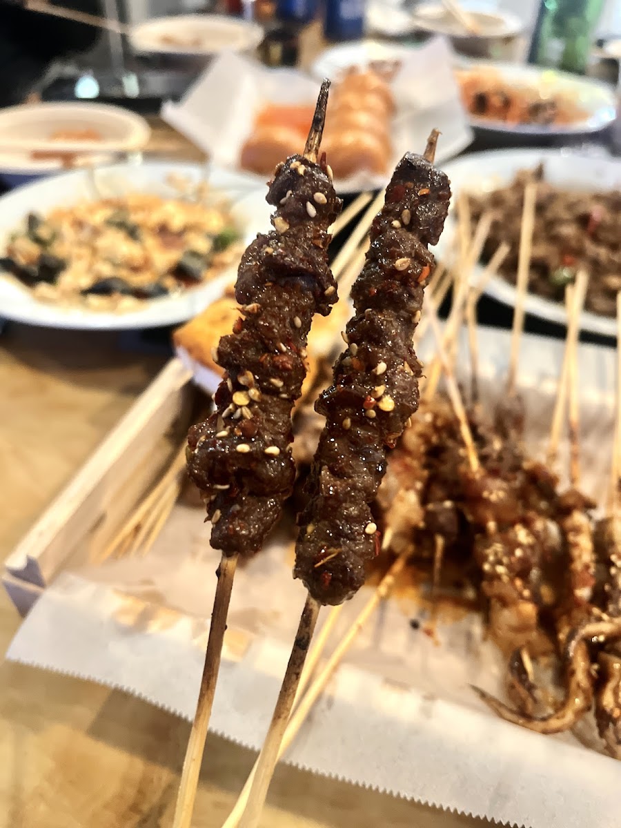 The menu leans heavily into grilled lamb skewers and adventurous tinfoil dishes like cheese corn kernels or spicy duck blood, paired with more familiar comfort items like pork and shrimp dumplings or fried buns. The flavors reflect a blend of casual barbecue with some bold, offbeat choices you won’t find everywhere, catering well to guests who want to share small plates while singing the night away.